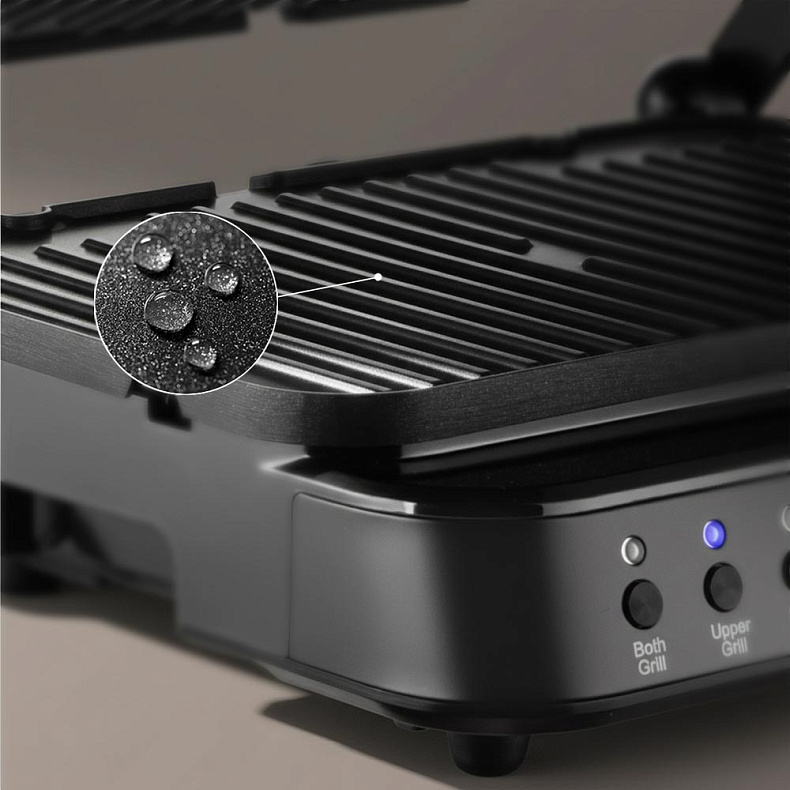 Инновационное антипригарное покрытие содержит минеральные добавки, что повышает прочность и улучшает антипригарные свойства панелей гриля. Вы можете легко готовить полезные блюда без растительного и сливочного масла.