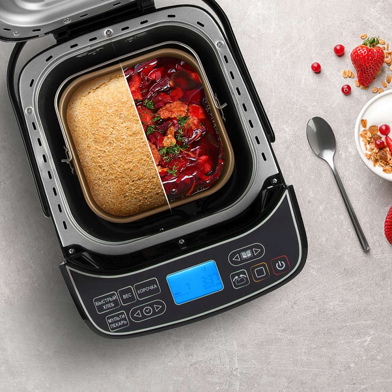 Возможности прибора не ограничиваются только выпечкой. Он способен сделать овощное рагу, ягодное варенье, плов и даже йогурт. Программы для выпекания хлеба включают в себя замешивание и расстаивание теста.