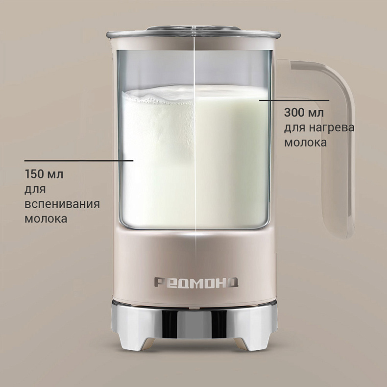 За один раз вы можете подогреть до 300 мл — это примерно один стакан молока. Чтобы взбить нежную пену идеальной консистенции, налейте в капучинатор до 150 мл молока.
