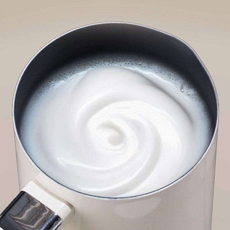 MF5002 не только взбивает пену, но и подогревает молоко. Это намного удобнее, чем греть его на плите. Благодаря антипригарному покрытию молоко не прилипает к стенкам, а после — прибор легко очистить.
