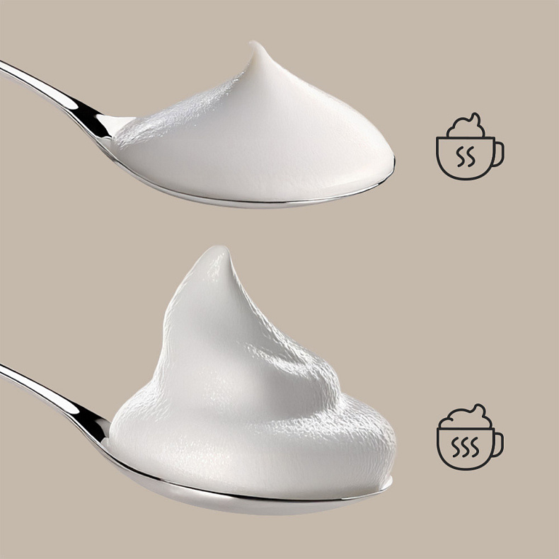 Консистенцию молочной пены можно регулировать для идеального вкуса напитка. Приготовьте плотную пену для насыщенного капучино или макиато, а легкую и воздушную — для нежного латте или флэт уайта.