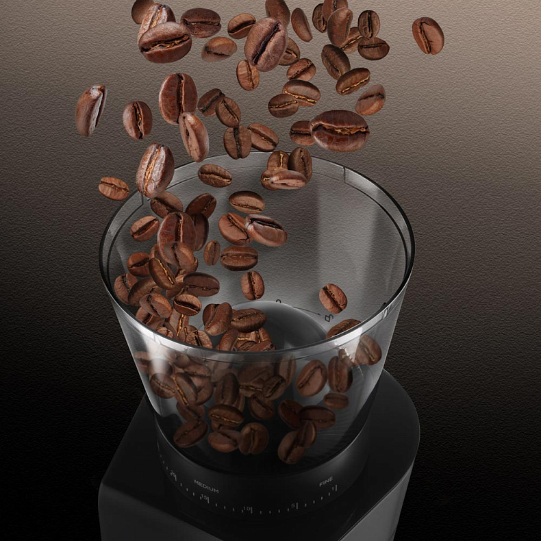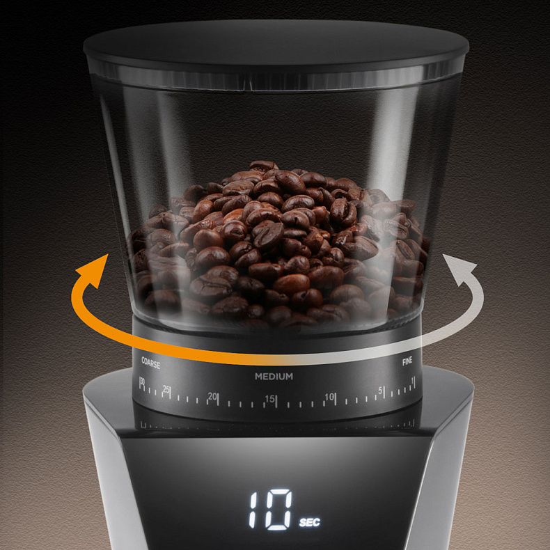 Регулируйте степень помола от мелкой до крупной для приготовления разных видов кофе. Для турки подойдет более мелкий помол зерен, а для гейзерной кофеварки — более крупный.