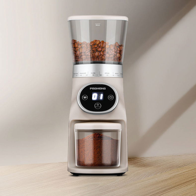 Благодаря вместительному контейнеру для зерен вы можете измельчить кофе для нескольких чашек сразу. В контейнер для молотого кофе помещается до 100 г измельченных зерен, что позволяет приготовить напитки для близких и друзей.