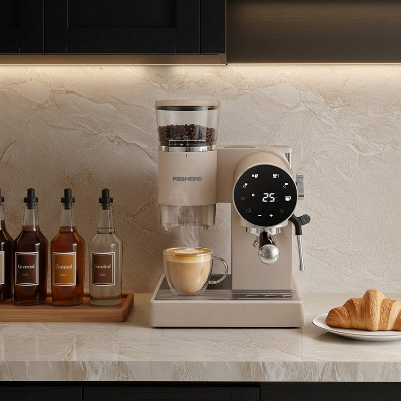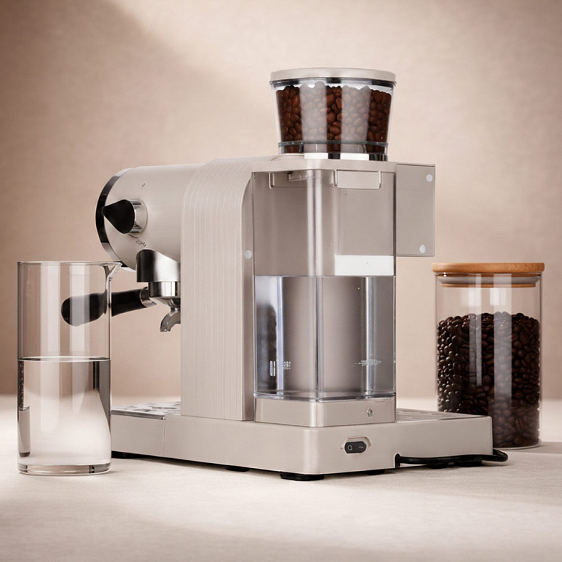 Кофейная станция отличается продуманной архитектурой корпуса: сбалансированные пропорции и четкие геометрические линии подчеркивают ее премиальный характер. Все элементы устройства объединены в единую эстетичную композицию, которая превращает процесс приготовления кофе в изысканный ритуал.