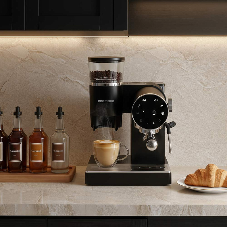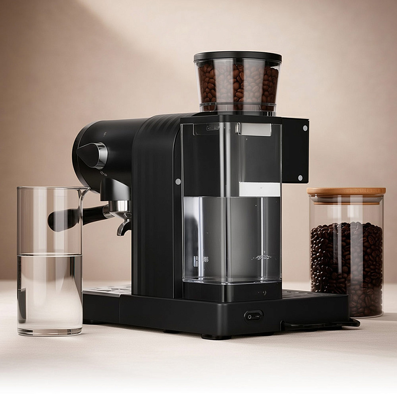 Кофейная станция отличается продуманной архитектурой корпуса: сбалансированные пропорции и четкие геометрические линии подчеркивают ее премиальный характер. Все элементы устройства объединены в единую эстетичную композицию, которая превращает процесс приготовления кофе в изысканный ритуал.