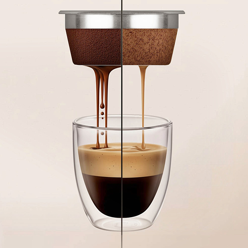 Перед приготовлением молотый кофе слегка увлажняется для равномерной экстракции. Это помогает глубже раскрыть вкус зерна, поэтому эспрессо и американо получаются более плотными и выразительными.
