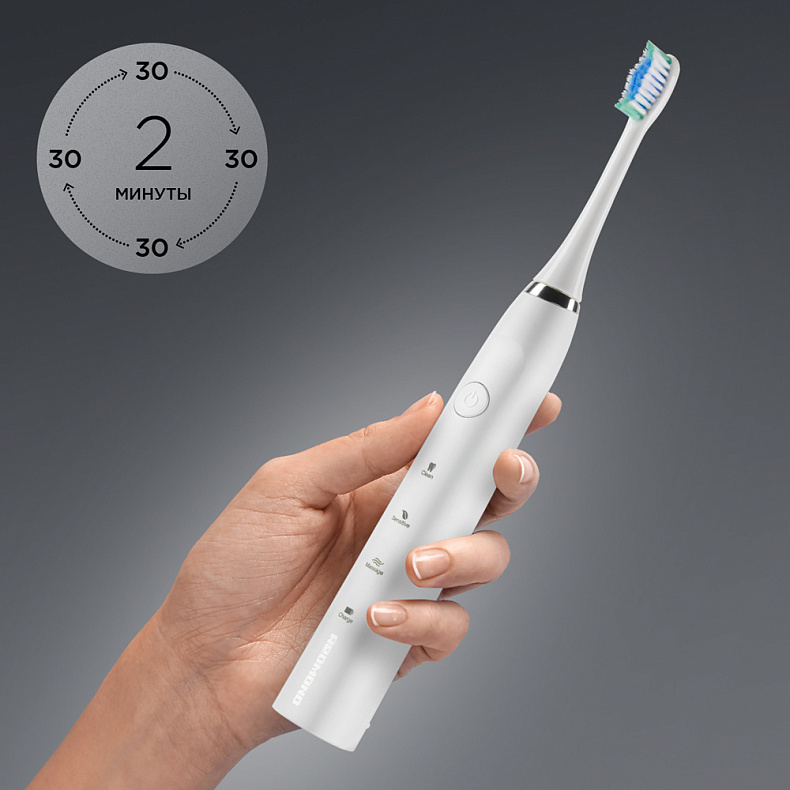 Стоматологи рекомендуют чистить зубы не менее 2 минут, поэтому мы оснастили щетку таймером. Каждые 30 секунд она делает паузу, напоминая сменить область чистки и не задерживаться на одном месте.