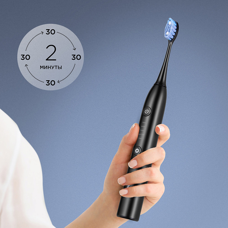 Зубная щетка оснащена таймером, который каждые 30 секунд предупреждает о необходимости сменить зону очистки. 2 минут хватит, чтобы уделить внимания всем зубам и деснам и не травмировать эмаль.