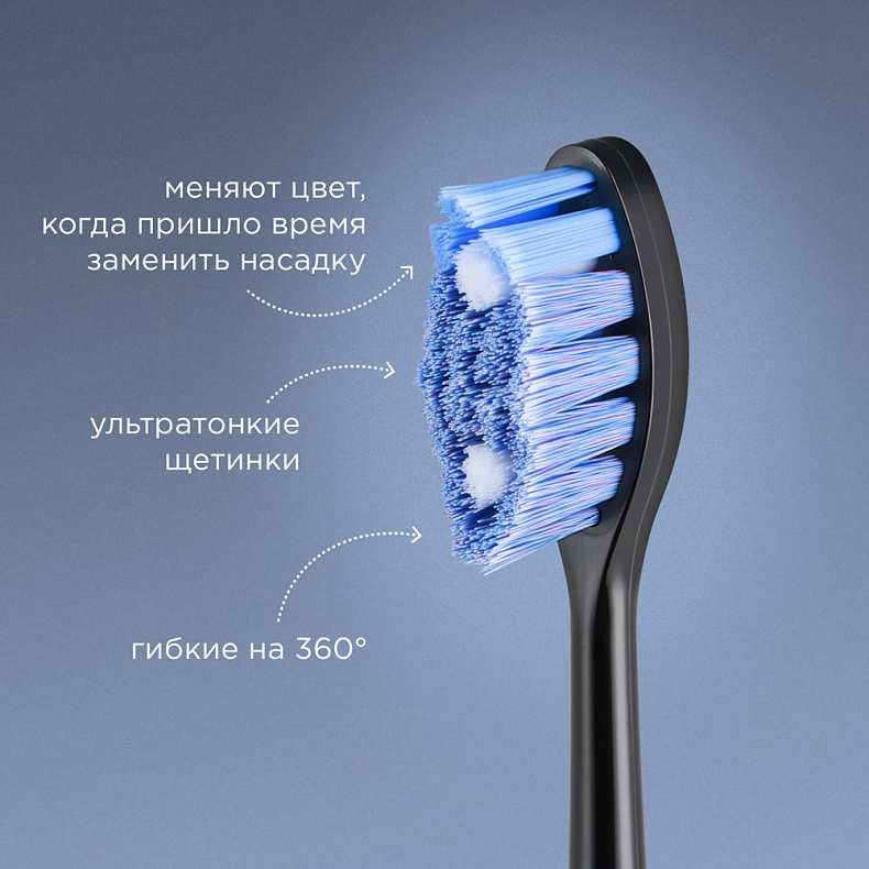 Щетинки премиального качества Pedex для бережного и качественного ухода за зубами и деснами: ультратонкие, гибкие на 360 градусов и меняют цвет, если насадку необходимо сменить.