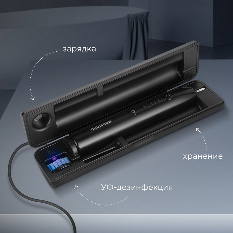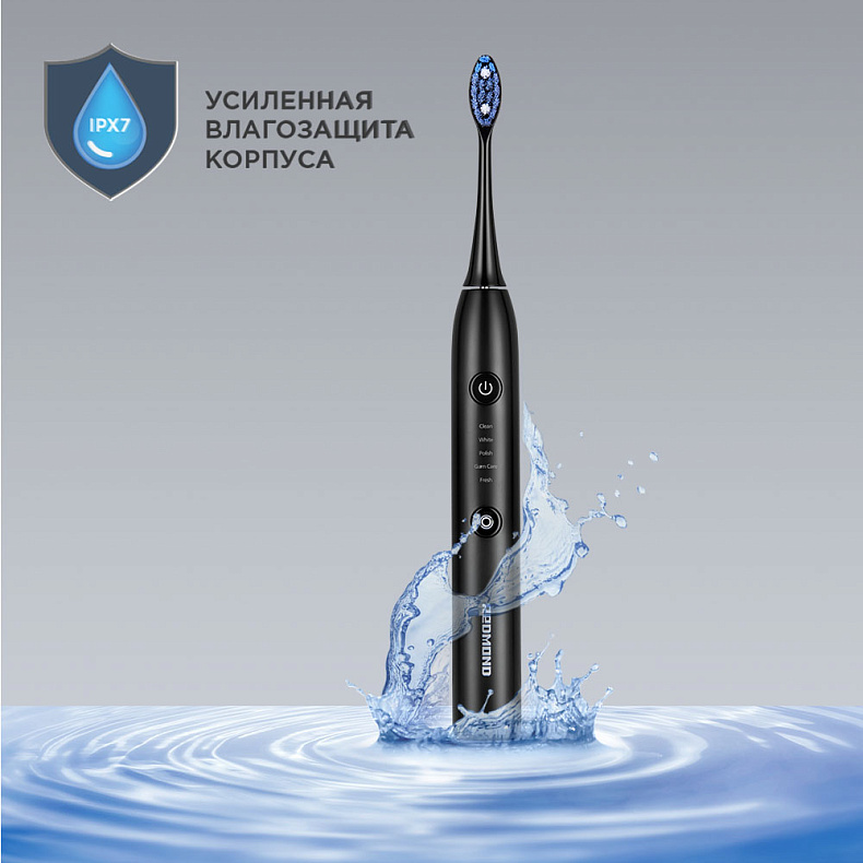 Корпус прибора выполнен с надежной защитой от влаги по стандарту IPX7. Это означает, что устройство выдерживает контакт с водой и подходит для использования в условиях повышенной влажности. Вы можете держать щетку мокрыми руками, пользоваться ею у раковины или в душе, не переживая за безопасность и работоспособность.
