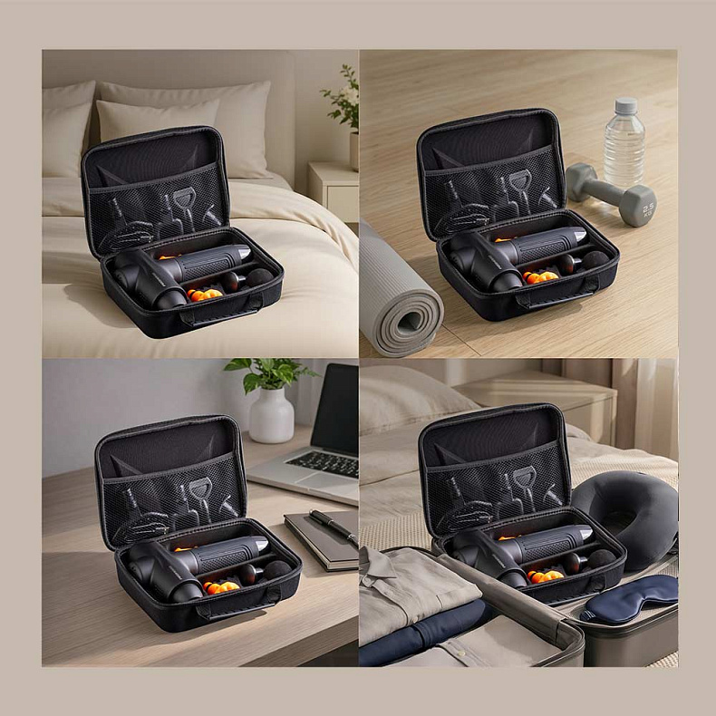 Массажер разработан с акцентом на максимальный комфорт при каждом использовании. Тихая работа с уровнем шума менее 45 дБ позволяет проводить сеансы без дискомфорта для окружающих. Компактный кейс удобен для хранения и безопасной переноски устройства. Используйте массажер дома, на работе, в спортзале или берите с собой в поездки.