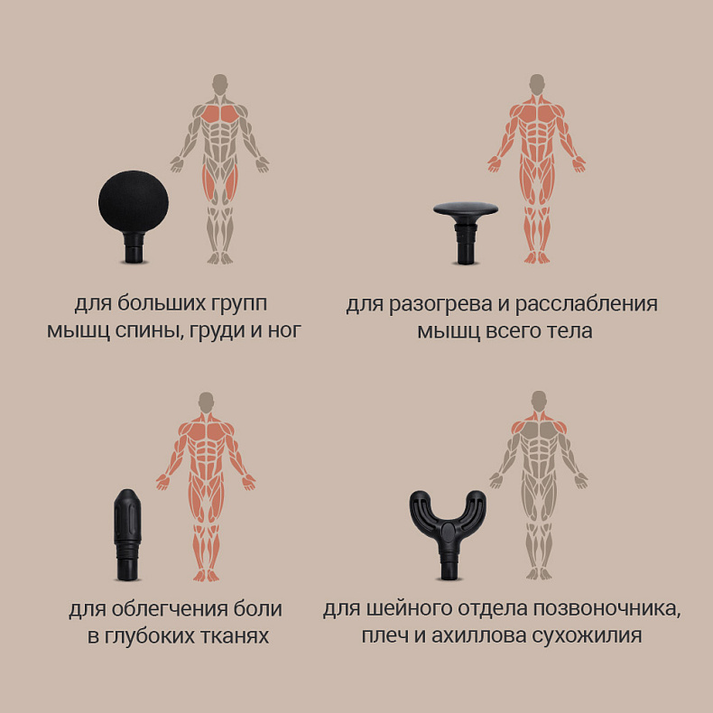 В комплект входят четыре насадки, которые обеспечивают точную и эффективную проработку всего тела. Каждая насадка разработана для конкретных зон: от шейного отдела и плеч до крупных мышц спины, груди и ног. Массажер подходит как для мягкого разогрева и расслабления, так и для глубокого воздействия на напряженные ткани. Это универсальное решение для комплексного восстановления и снятия боли.