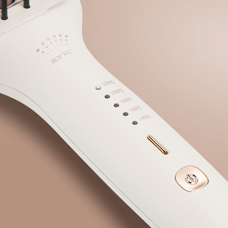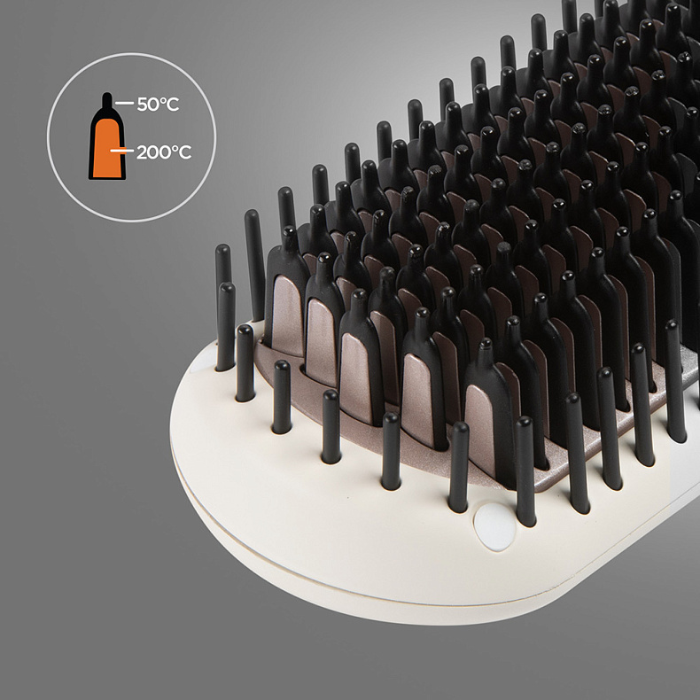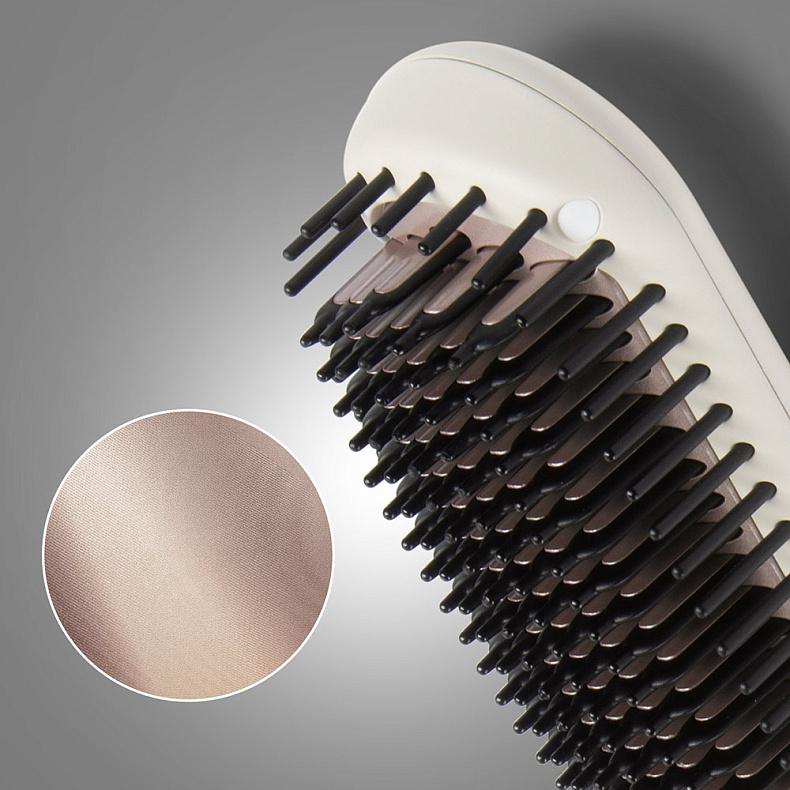 Гладкие зубцы покрыты щадящим волосы материалом — керамикой. Зубцы по всей расческе нагреваются равномерно, что позволяет быстро и бережно приводить прическу в порядок.