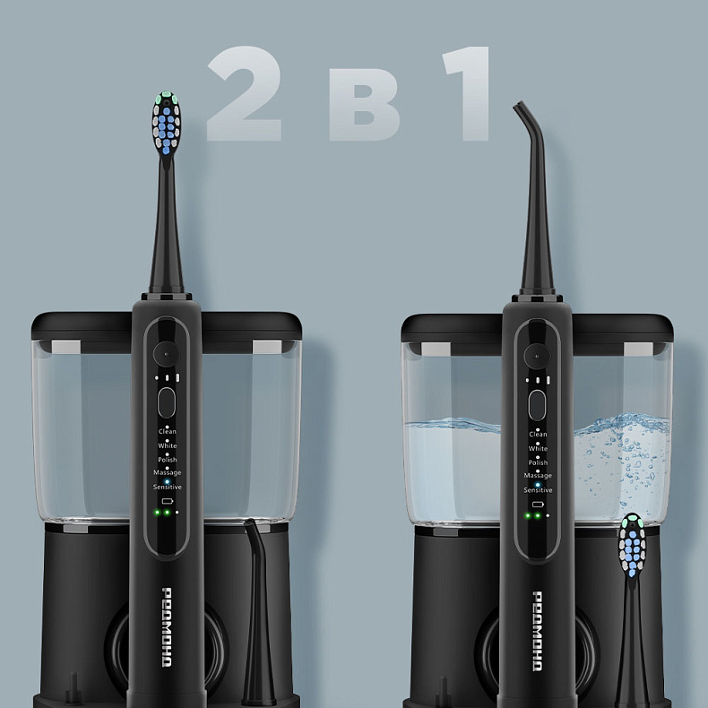 Режимы позволят адаптировать работу зубного центра под ваши особенности. 3 режима интенсивности для ирригатора и 5 режимов работы для щетки подходят для всесторонней заботы о вашей улыбке.