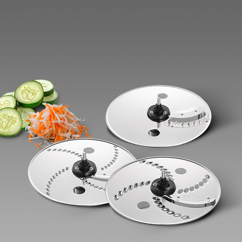 В комплекте 2 терки-шинковки для мелкой и крупной нарезки овощей, сыра и других продуктов. Насадки позволят за минуту нашинковать кочан капусты для тушения и ровно нарезать морковь для салата.
