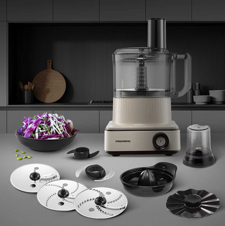 Комбайн оснащен плавным регулятором, поэтому вы можете постепенно повышать и снижать скорость, если это нужно по рецепту. Импульсный режим поможет добиться однородности молотого кофе или овощного пюре.