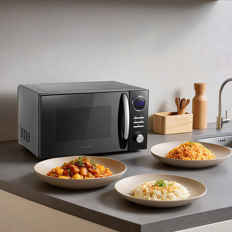 Микроволновая печь подходит для разогрева как небольших порций, так и полноценных блюд. Например, в нее поместится курица гриль. А благодаря компактному корпусу место для СВЧ найдется даже на небольшой кухне.