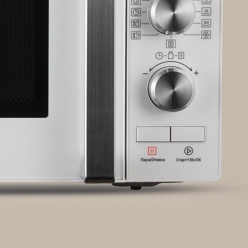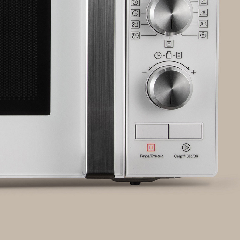 Разогреть пищу можно при помощи одной кнопки. Нажмите «Старт» — и включится разогрев на максимальной мощности на 30 секунд. Каждое последующее нажатие увеличит время еще на 30 секунд. Это удобно, когда нужно быстро разогреть ужин.