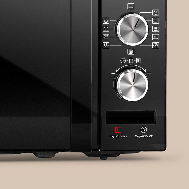 Разогреть пищу можно при помощи одной кнопки. Нажмите «Старт» — и включится разогрев на максимальной мощности на 30 секунд. Каждое последующее нажатие увеличит время еще на 30 секунд. Это удобно, когда нужно быстро разогреть ужин.