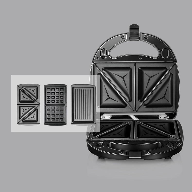 Кнопка выключения мультипекаря удобно расположена сзади. Все три панели в комплекте, и они легко заменяются. Горячие бутерброды получаются отлично пропеченными, а для более румяной корочки стоит подержать чуть дольше. Ничего не пригорает, всё работает безупречно.