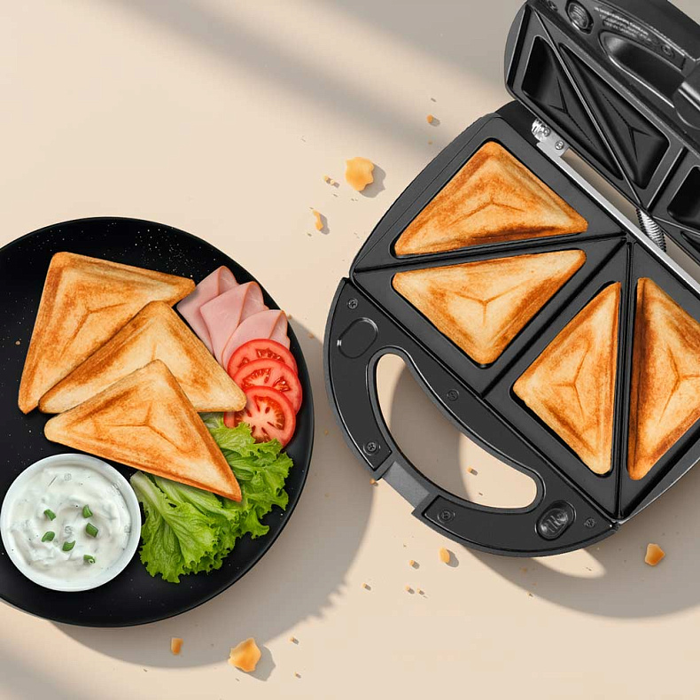 Съемные панели позволяют готовить треугольные сэндвичи с хрустящей корочкой. Бутерброды с разнообразной начинкой выручат в любом месте — в школе, аэропорту или на пикнике.