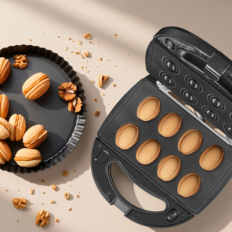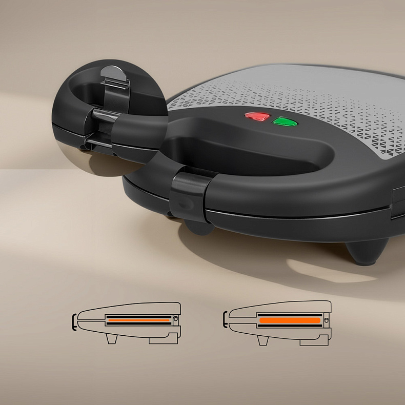Мультипекарь дарит равномерный золотистый румянец без сырых серединок и подгоревших краев. Крышка плотно прижимает продукты любой толщины, поэтому тепло распределяется максимально эффективно. Удобный замок-защелка с двумя уровнями высоты позволяет выбрать оптимальный режим: для жидкого теста и тонких хрустящих вафель или для пышного теста, сэндвичей и объемных начинок.