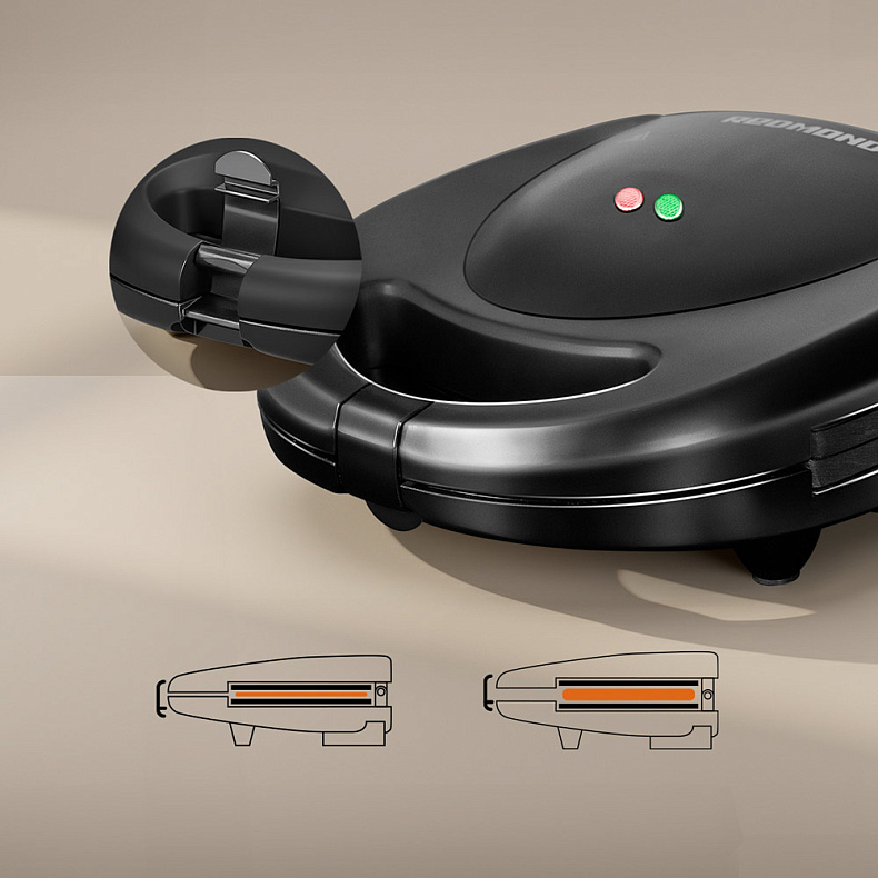 Мультипекарь дарит равномерный золотистый румянец без сырых серединок и подгоревших краев. Крышка плотно прижимает продукты любой толщины, поэтому тепло распределяется максимально эффективно. Удобный замок-защелка с двумя уровнями высоты позволяет выбрать оптимальный режим: для жидкого теста и тонких хрустящих вафель или для пышного теста, сэндвичей и объемных начинок.