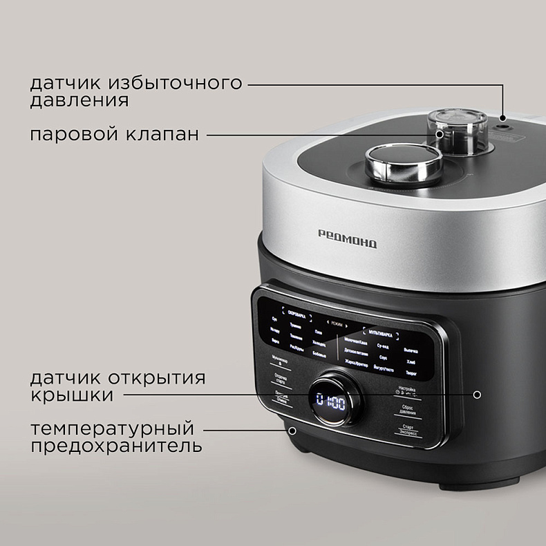 Клапан для выпуска пара, температурный предохранитель, датчик избыточного давления и датчик открытия крышки обеспечивают безопасное использование прибора на каждом этапе, чтобы вы могли спокойно сосредоточиться на приготовлении вкусных и полезных блюд.