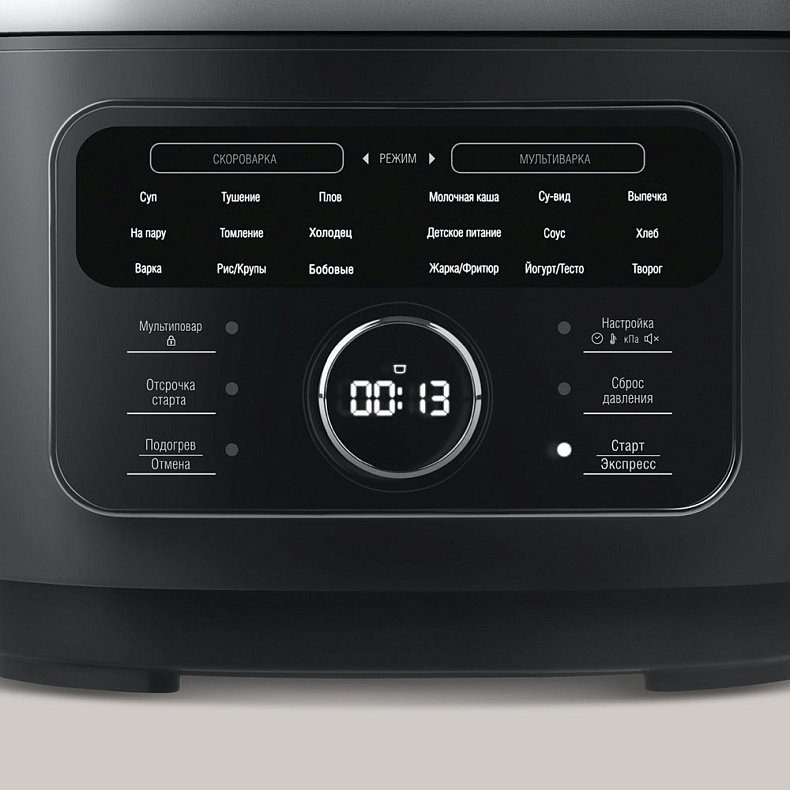Элегантная мультиварка-скороварка в лаконичном корпусе серого цвета дополнит интерьер любой кухни. Сенсорный дисплей с удобным регулятором управления гарантирует комфорт использования. Включить прибор и установить необходимые настройки температуры, времени и давления не составит труда: все режимы и автопрограммы подписаны.