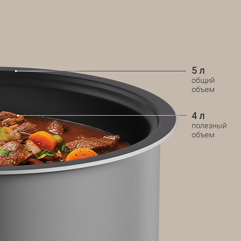 Чаша оптимального объема (6–8 порций) выполнена из безопасных материалов, которые обеспечивают равномерный нагрев и высокое качество готовки. Антипригарный слой предотвращает прилипание продуктов и упрощает уход. Общий объем емкости (5 л) — вместимость чаши до краев, а полезный объем, то есть рекомендуемый уровень заполнения чаши перед приготовлением для оптимальной работы скороварки составляет 4 л.