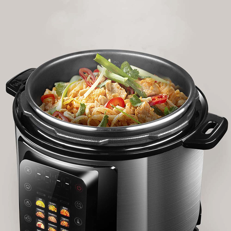 Чаша увеличенной вместимости рассчитана на приготовление 8–10 порций и подойдет для большой семьи или приема гостей. Она изготовлена из безопасных материалов, обеспечивающих равномерный нагрев, а антипригарное покрытие упрощает уход. Общий объем чаши составляет 6 литров, при этом полезный объем для приготовления — 5 литров.