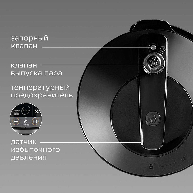 Необходим для стабильной работы мультиварки-скороварки. Выпустить излишний пар можно одним нажатием кнопки. Она расположена на безопасном расстоянии от парового клапана и не даст обжечься.