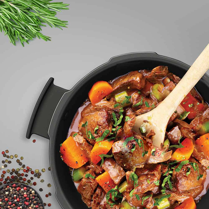 RMC-P470 можно использовать и для медленного томления. Такой способ сохраняет максимум витаминов и делает вкус блюд насыщенным. Например, мясо получается мягким и сочным, а овощи — ароматными.