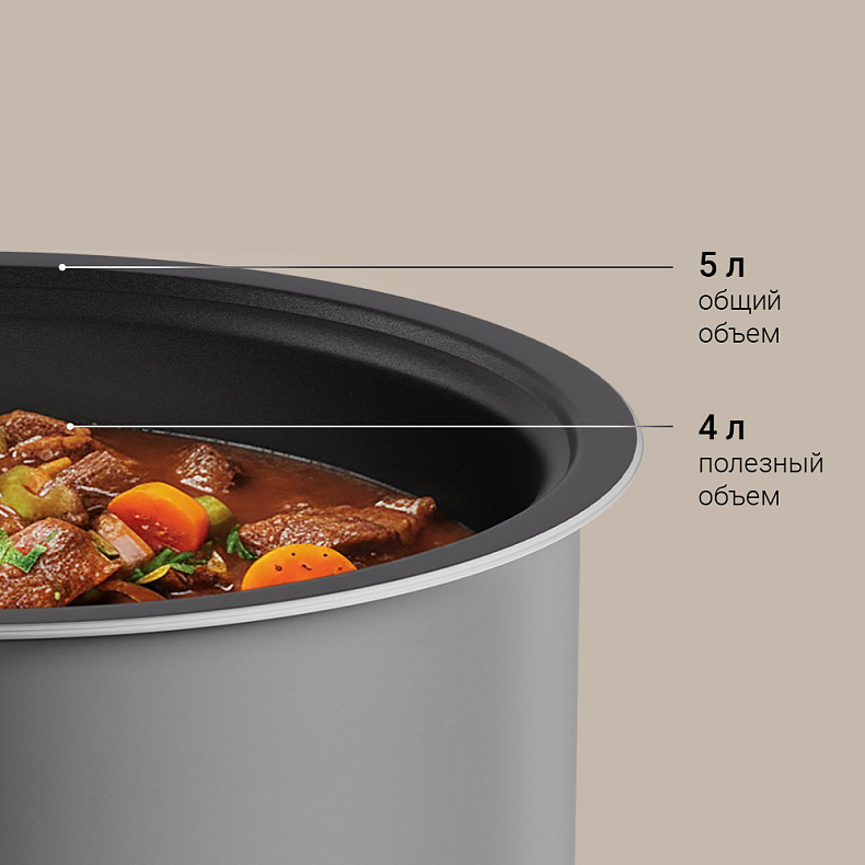 Чаша предназначена для приготовления блюд на 6–8 человек и удобна в ежедневном использовании. Антипригарный слой снижает риск пригорания и облегчает очистку чаши. Общий объем (максимальная вместимость до краев) — 5 литров, рекомендуемый полезный объем для работы — 4 литра.