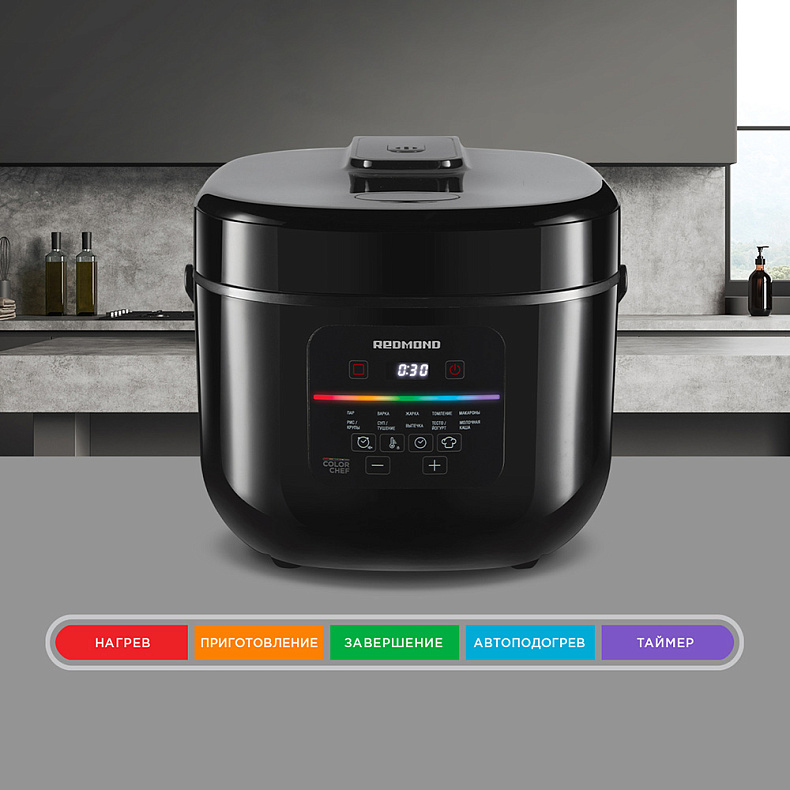 Готовить стало проще — теперь этапы готовки подсвечиваются разными цветами. Например, когда блюдо готово, на шкале горит зеленый. Вы сразу увидите, пора ли звать всех к столу или еще рано.