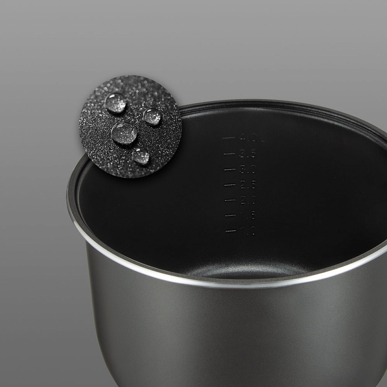 Чаша средней вместимости, рассчитанная на 6–8 порций, изготовлена из безопасных и прочных материалов, способствующих равномерному распределению тепла и стабильному результату приготовления блюд. Современное антипригарное покрытие исключает пригорание пищи и делает процесс очистки быстрым и удобным. Общий объем (вместимость до краев) составляет 5 литров, однако для корректной и эффективной работы мультиварки рекомендуется использовать до 4 литров — это ее полезный объем.