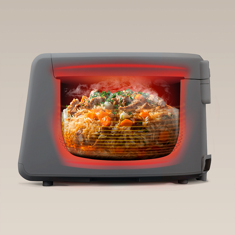 Чаша нагревается со всех сторон — снизу, по бокам и сверху. Это обеспечивает равномерное приготовление: плов получится рассыпчатым, а запеканка — с идеальной корочкой. Также эта технология гарантирует качественный и быстрый разогрев готовых блюд.