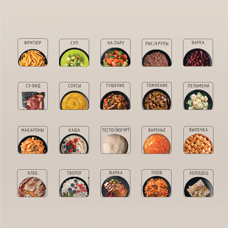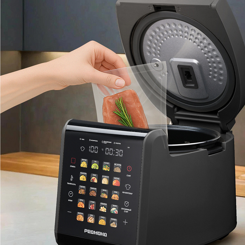Используйте программы МУЛЬТИПОВАР, ТОМЛЕНИЕ или СУ-ВИД, чтобы готовить пищу при низкой температуре, как в медленноварке. Это поможет сохранить полезные свойства продуктов и придать им насыщенный вкус. Например, у вас получится изумительное рагу или сочное тушеное мясо.