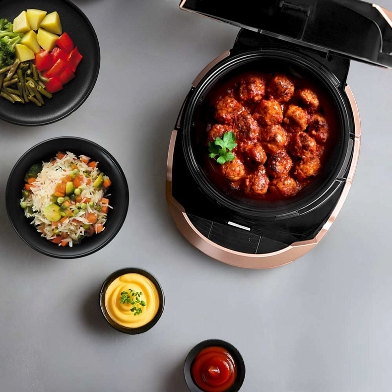 Невероятный дизайн, такое ощущение что она прибыла из будущего. Покупала только из за внешнего вида, но как оказалось, она может готовить любое блюдо, причем в полностью автоматическом режиме, ничего не нужно помешивать или следить за готовкой.