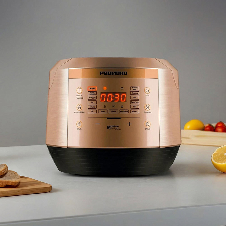 Мультиварка RMC-450 представлена в трендовом цвете — бронзовом. Дизайн понравится тем, кто ценит не только функциональность, но и эстетичность техники.