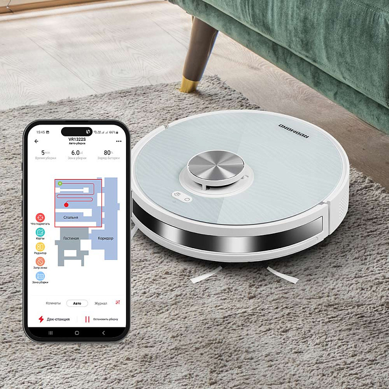 Через приложение доступен расширенный функционал умного прибора: вы можете выбрать определённую зону для уборки, задать день и время активации, регулировать уровень подачи воды и режим всасывания. Контролируй работу пылесоса и корректируй настройки в режиме реального времени!