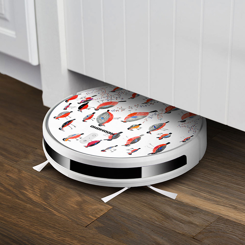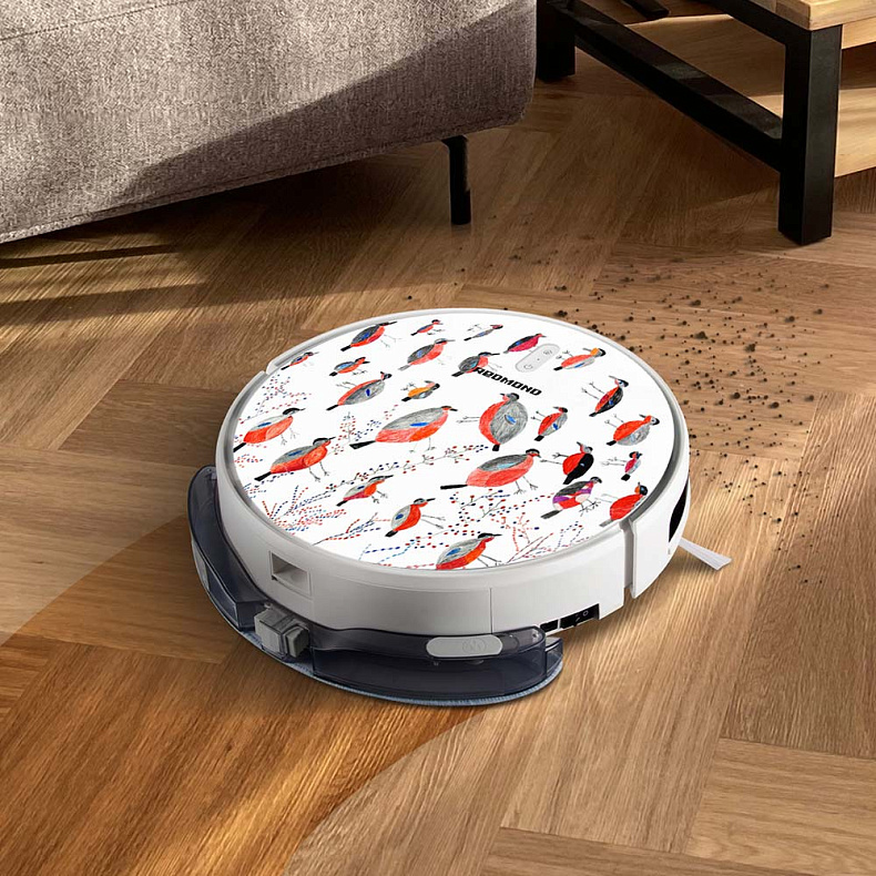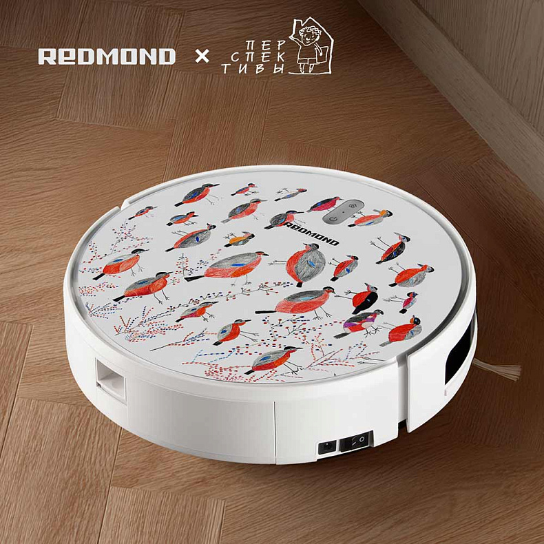 Коллаборация REDMOND с благотворительной организацией «Перспективы» подарила серию искренних и необычных визуальных историй, воплощенных в дизайне крышек роботов-пылесосов. Одну из них — «Снегири» — написала Юлия Родина, художница, чьи работы узнаются по декоративной манере.