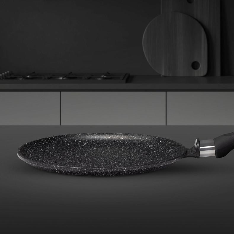 Стандартный размер посуды для приготовления блинов. Жидкое тесто равномерно распределится по дну сковороды — вы без проблем перевернете блинчик на другую сторону.
