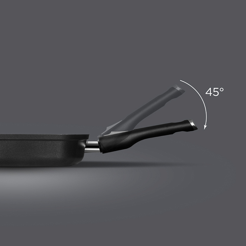 Эргономичная ручка сковороды-гриль отлично ложится в руку и не скользит, что делает процесс готовки удобным. Она просто снимается, если нужно сэкономить место при хранении в шкафу.
