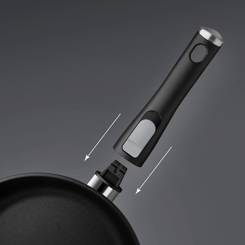 Эргономичная ручка сделает процесс приготовления еды максимально легким. Если нужно приготовить блюдо в духовке — открепите ее одним движением.