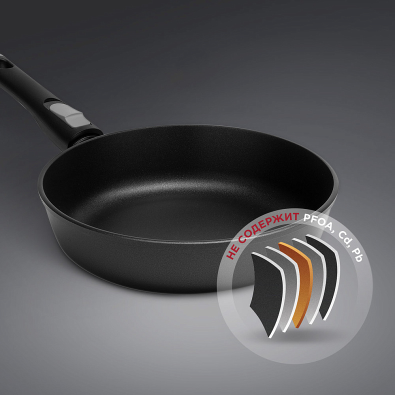 Инновационное многослойное антипригарное покрытие защитит блюда от пригорания. При правильном использовании долго прослужит: мойте сковороду только мягкими губками и нейтральными моющими средствами.