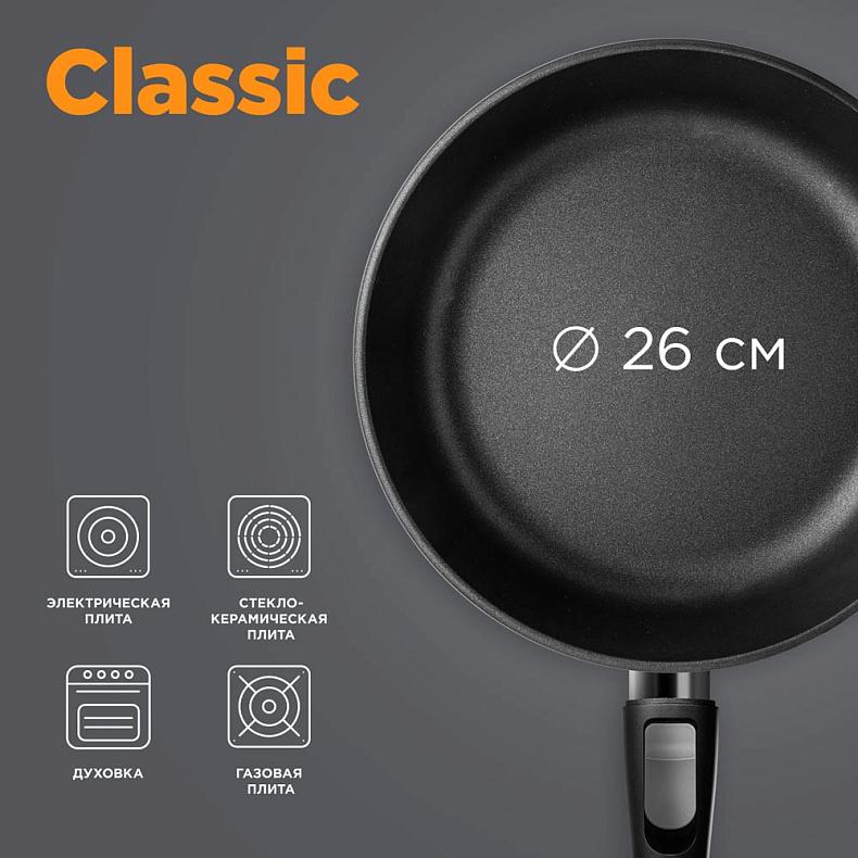 Классическая сковорода из литого алюминия для тушения, жарки, запекания. Подходит для духового шкафа (без ручки) и газовых, электрических и стеклокерамических варочных поверхностей.