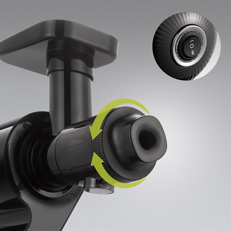 Если на шнек намотались волокна или мякоть скопилась и мешает отжиму сока, поможет эта функция. Шнек прокрутится в обратном направлении и разблокируется, а вам не придется прерываться и чистить прибор.