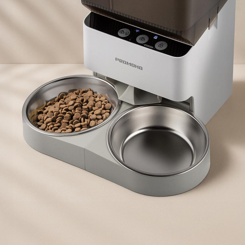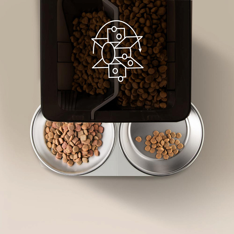 Кормушка оснащена контейнером с двумя отсеками на 2,2 и 3,3 литра — идеально для двух питомцев или диеты с разными видами корма. Освободитесь от рутины, чтобы больше общаться с любимцами.