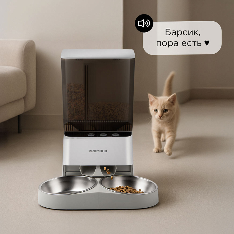 Будьте рядом с питомцем даже на расстоянии. Запишите свой голос, чтобы он всегда знал, когда пора есть. Голосовая команда поможет адаптировать животное к новой системе кормления и окружить его заботой.